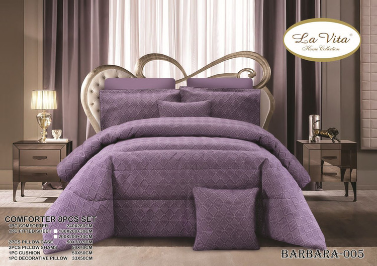 تعداد تکه: 8 تکه (1 عدد لحاف + 1 عدد ملحفه کشدوز تشک + 2 عدد روبالشی آکسفورد + 2 عدد روبالشی ساده + 2 عدد کوسن پر شده)