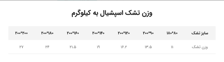 این تشک از فوم ویژه با وزن ۶۰ کیلوگرم و قطر ۱۶ سانتیمتر با استفاده از ترموفلت ۱۶۰۰ گرمی تهیه شده است. این ترموفلت در هر دو طرف پد اسفنجی ۳۰ کیلوگرمی و قطر ۴ سانتیمتر قرار دارد که روی آن لایه ترموباند ۲۵ گرمی از الیاف پلی استر ضد حساسیت قرار گرفته است. همچنین در این تشک از اسفنج ۱۷ کیلوگرمی با قطر ۸ میلیمتر که در پارچه نخ پنپه ۶۵۰ گرمی پنبدوزی شده است، استفاده شده. این تشک علاوه بر وزن مناسب و لایههای مختلف، دارای خواص ضد حساسیتی است که به راحتی میتواند به نیازهای مختلف افراد پاسخ دهد.