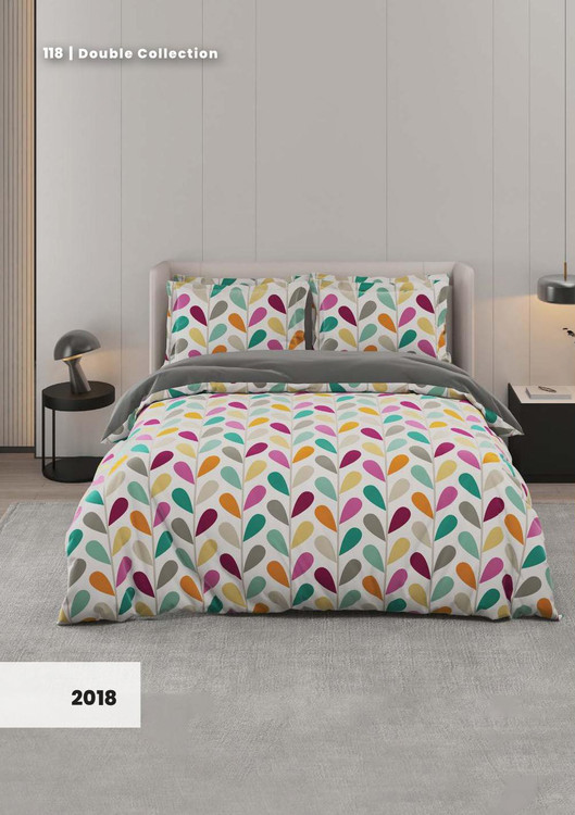 روتختی سهبعدی دونفره کد ۲۰۱۸ با طرح قطرهای رنگارنگ و زمینه سفید، فضای اتاق خواب را زنده، پرانرژی و مدرن میکند. ترکیب رنگهای صورتی، نارنجی، سبز و خاکستری، هماهنگی دلنشینی ایجاد کرده و برای روحیهبخشی به دکورهای ساده و خنثی بسیار مناسب است.